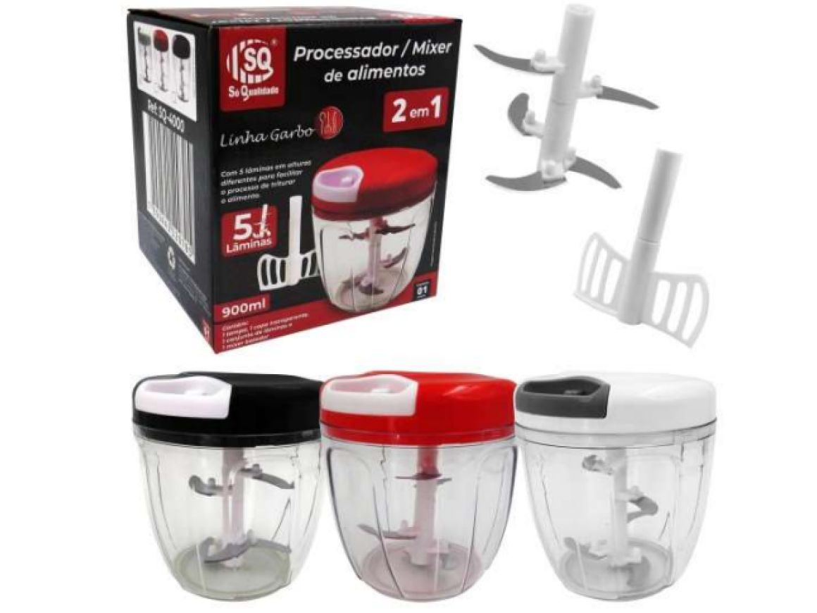 Com fundo emborrachado, acompanha 01 tampa, 01 copo transparente, 01 haste com 05 lâminas e 01 mixer batedor.