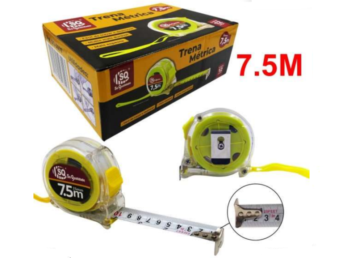 Com medida só em metro, letras grandes e largura da fita com 25mm